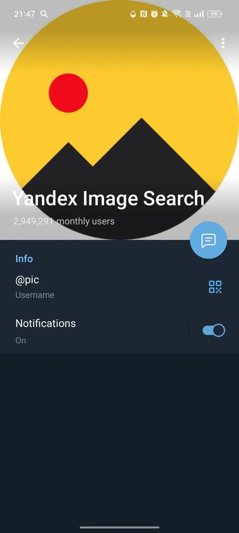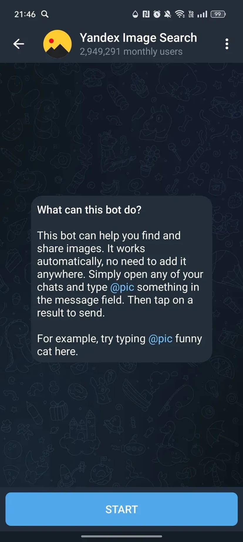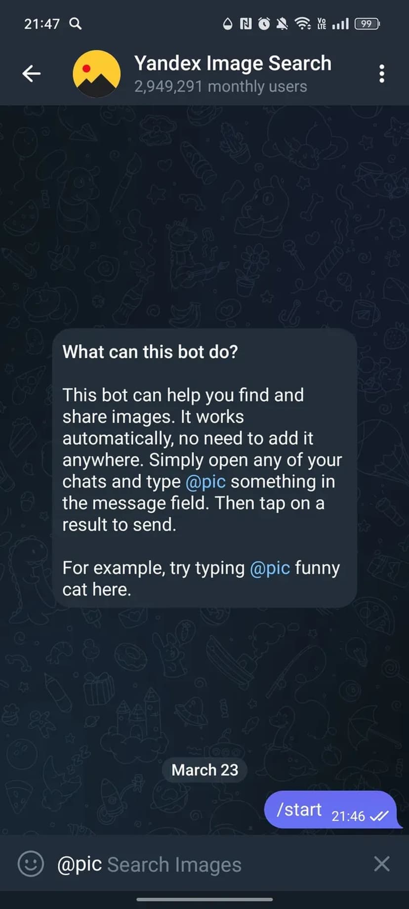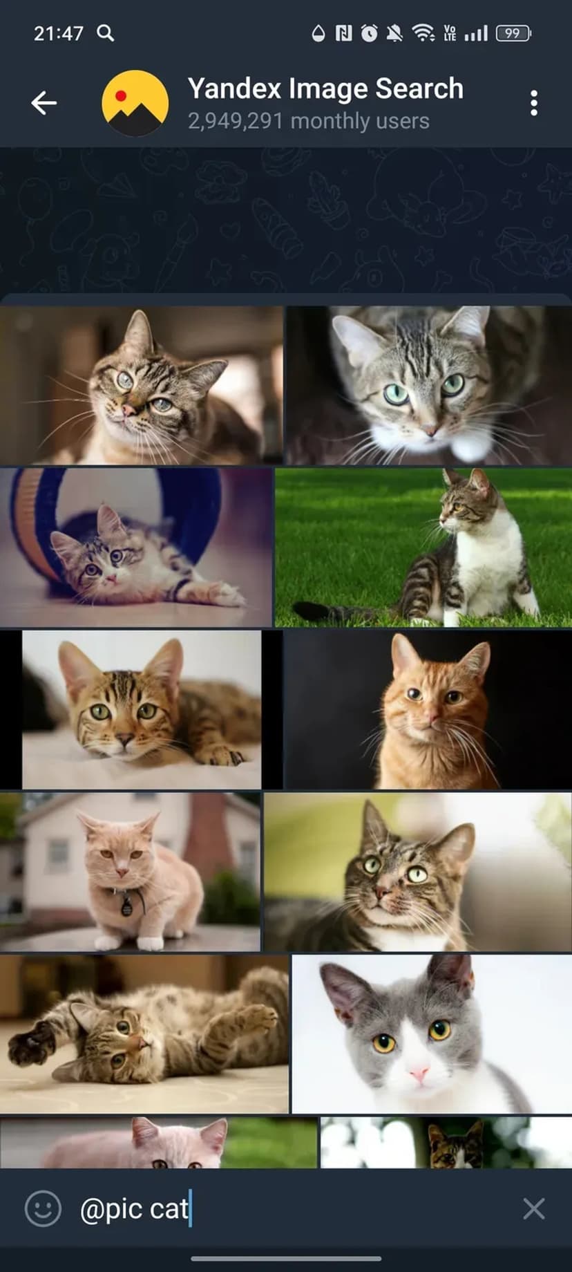 - Работа с результатами — пересылка, скачивание и использование найденных изображений в других чатах.