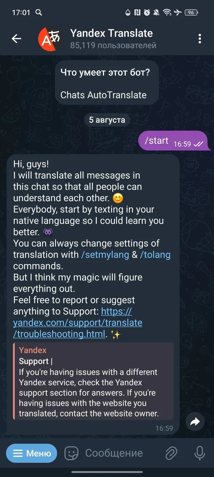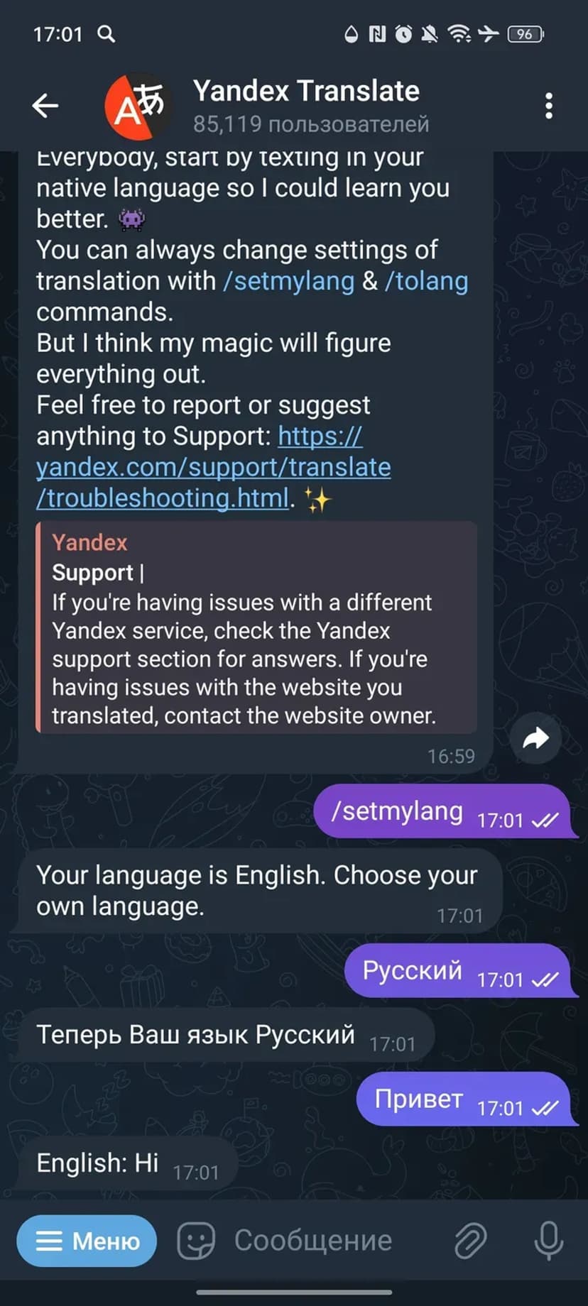 Приватность: обрабатываются только сообщения, требующие перевода. История переписки не сохраняется и не передаётся третьим лицам. Пользовательские настройки хранятся в Telegram и используются исключительно для корректной работы переводчика.