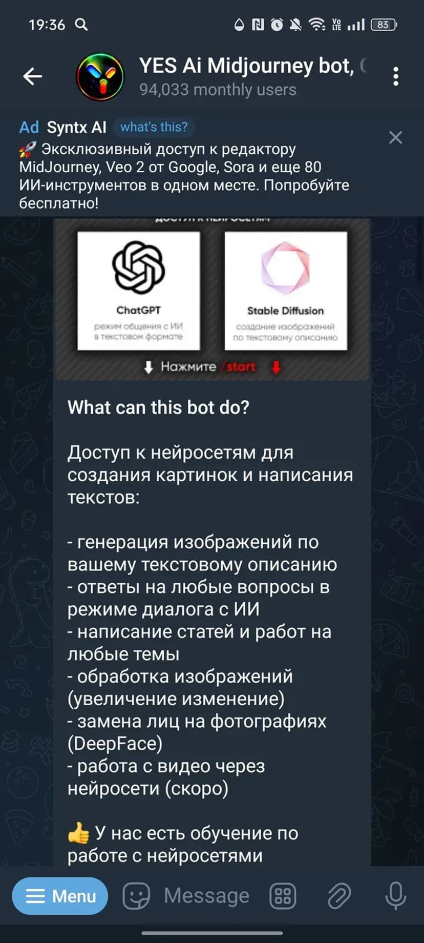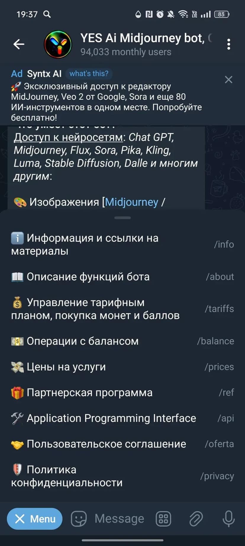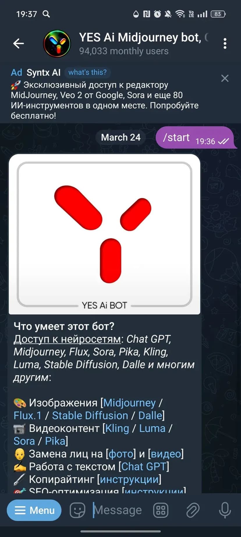 YES Ai объединяет популярные визуальные и текстовые нейросети — Midjourney, Stable Diffusion, ChatGPT, Kling Ai, Flux, Veo 3 и Sora Images — для создания изображений, анимаций и текстов непосредственно в чате.