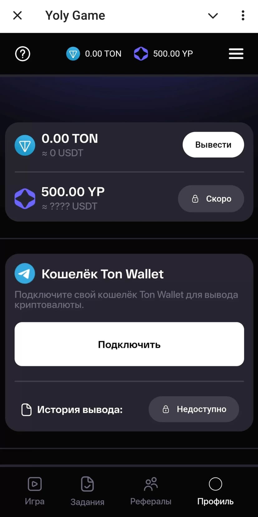 - Поддерживается привязка криптокошелька и вывод заработанных TON через профиль с подключением TON Wallet.