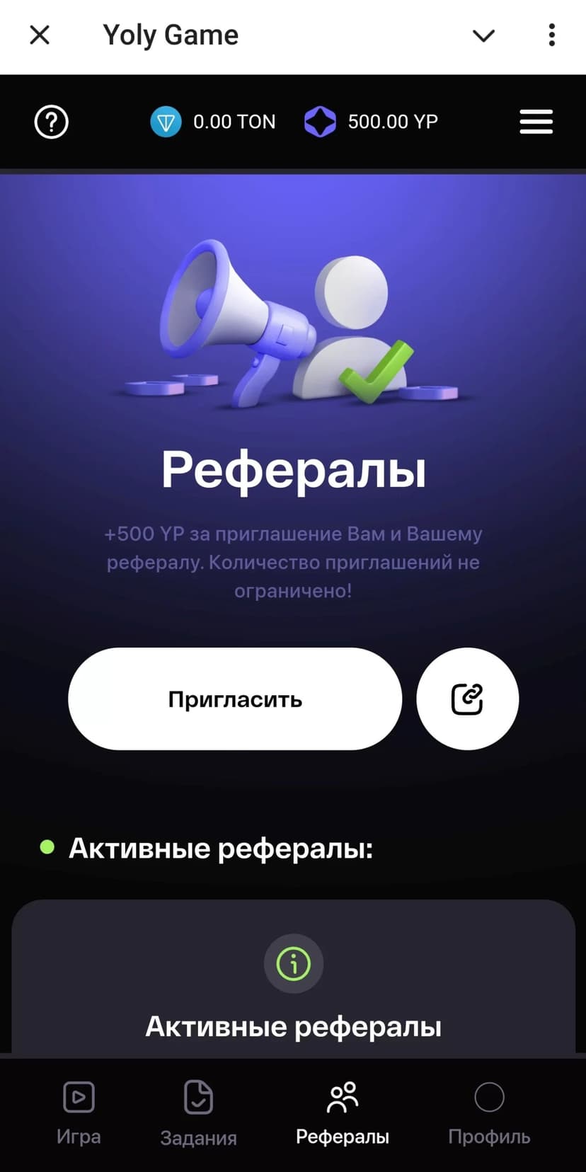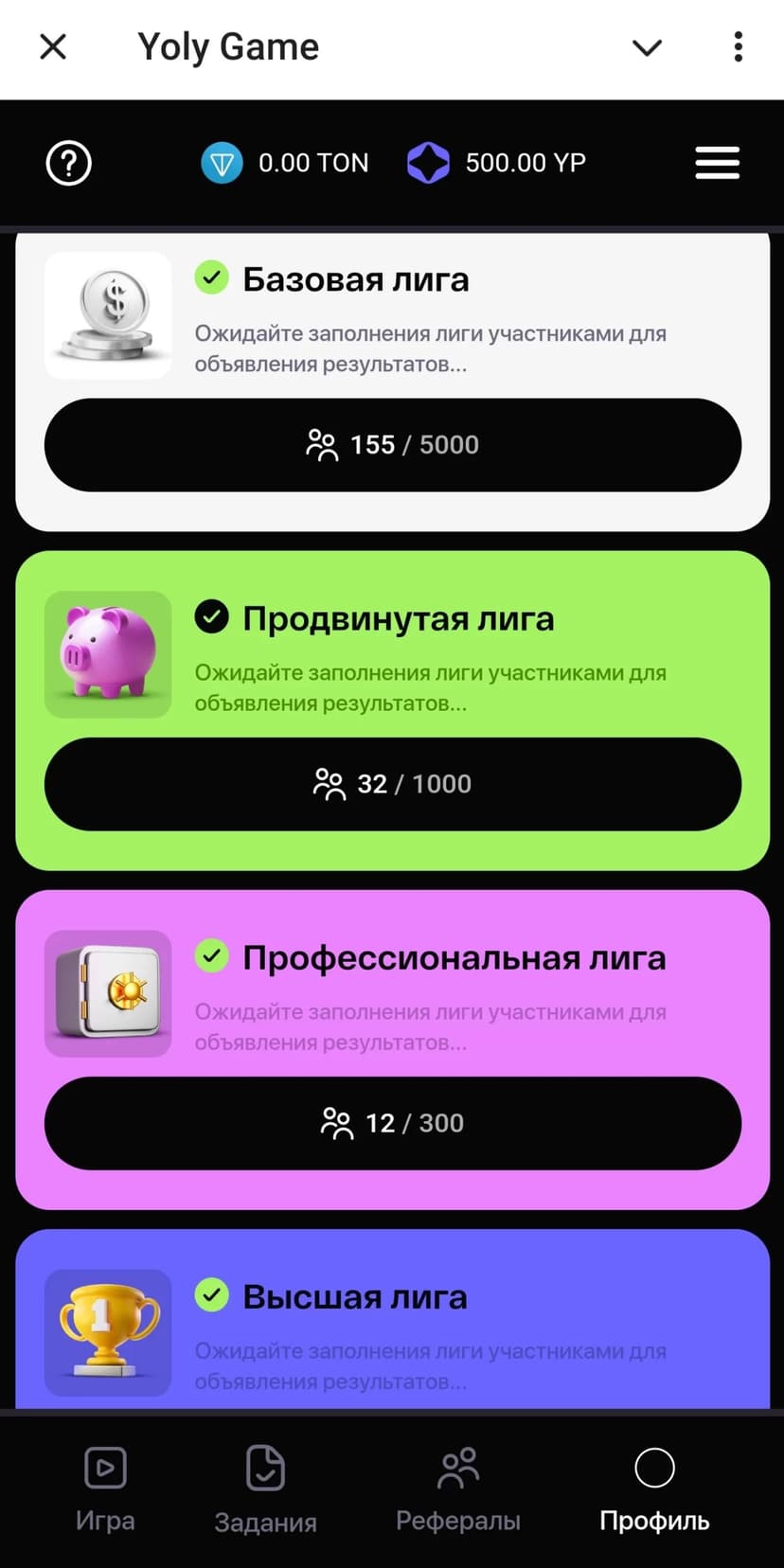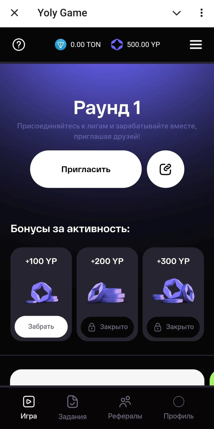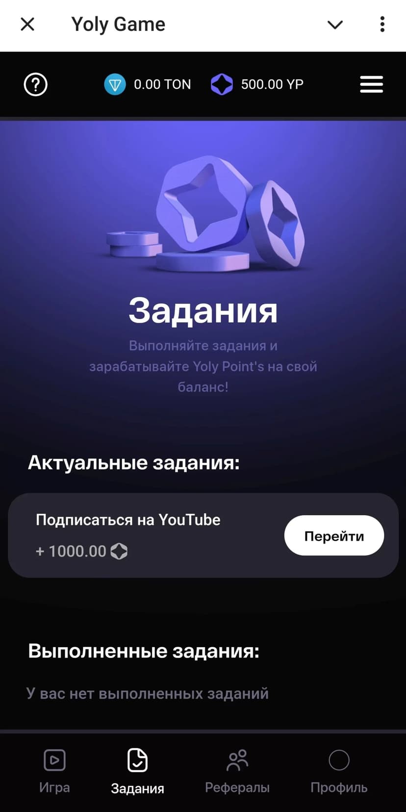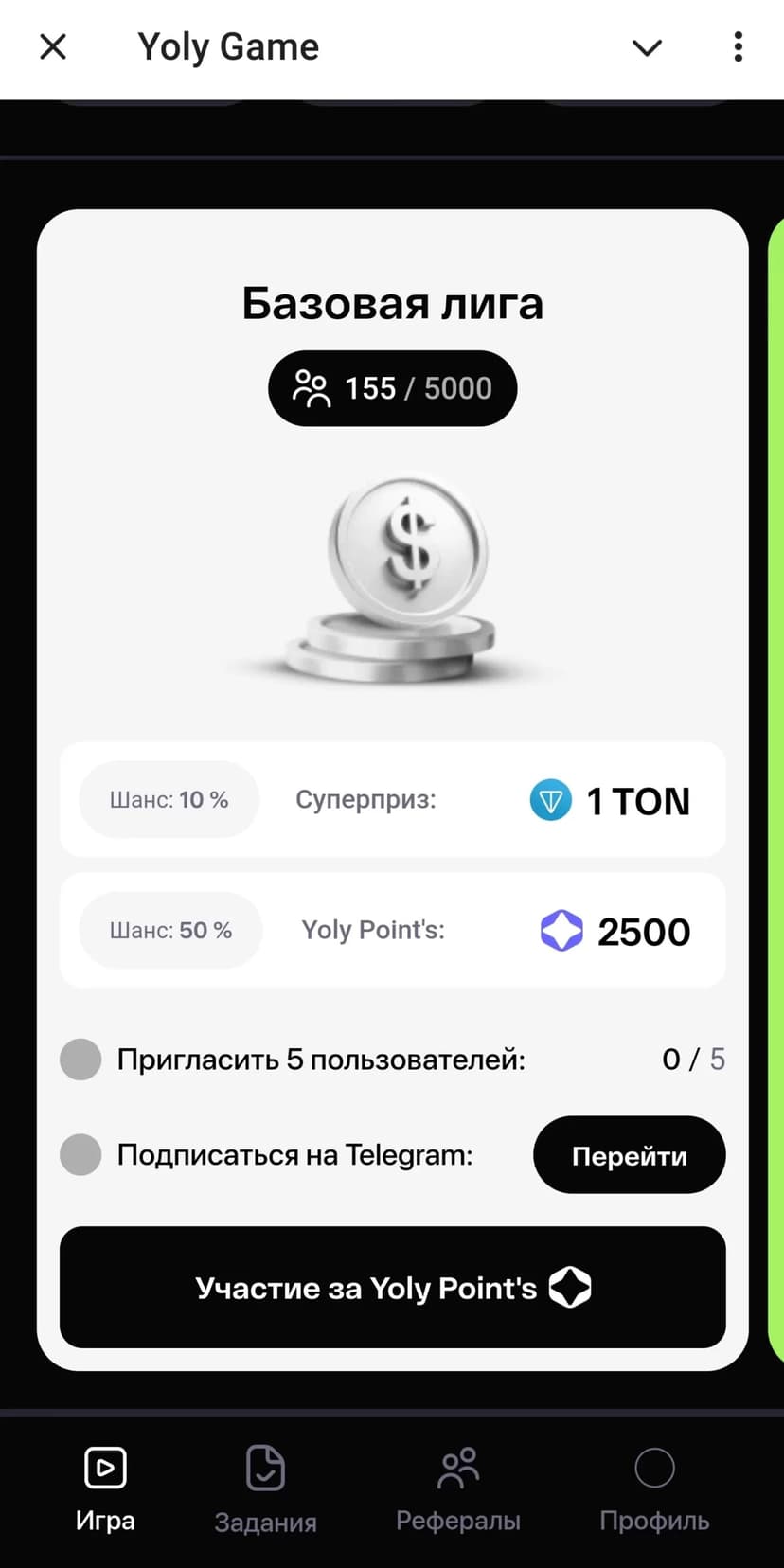 Игровые задания: зарабатывайте TON и Yoly Point's, участвуйте в лигах и выигрывайте.