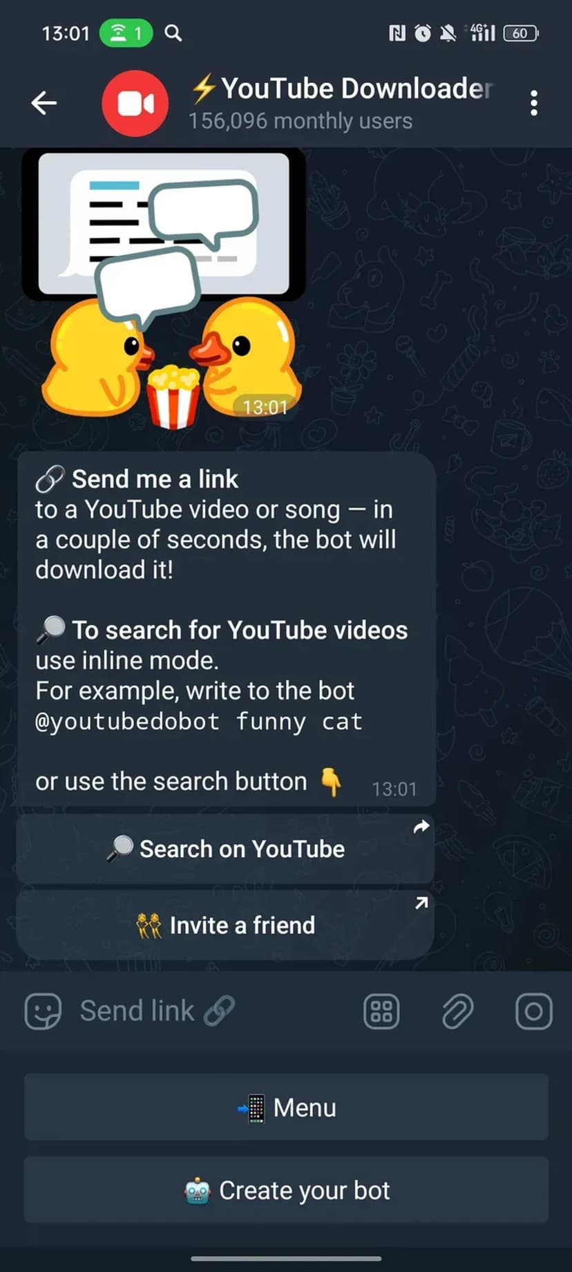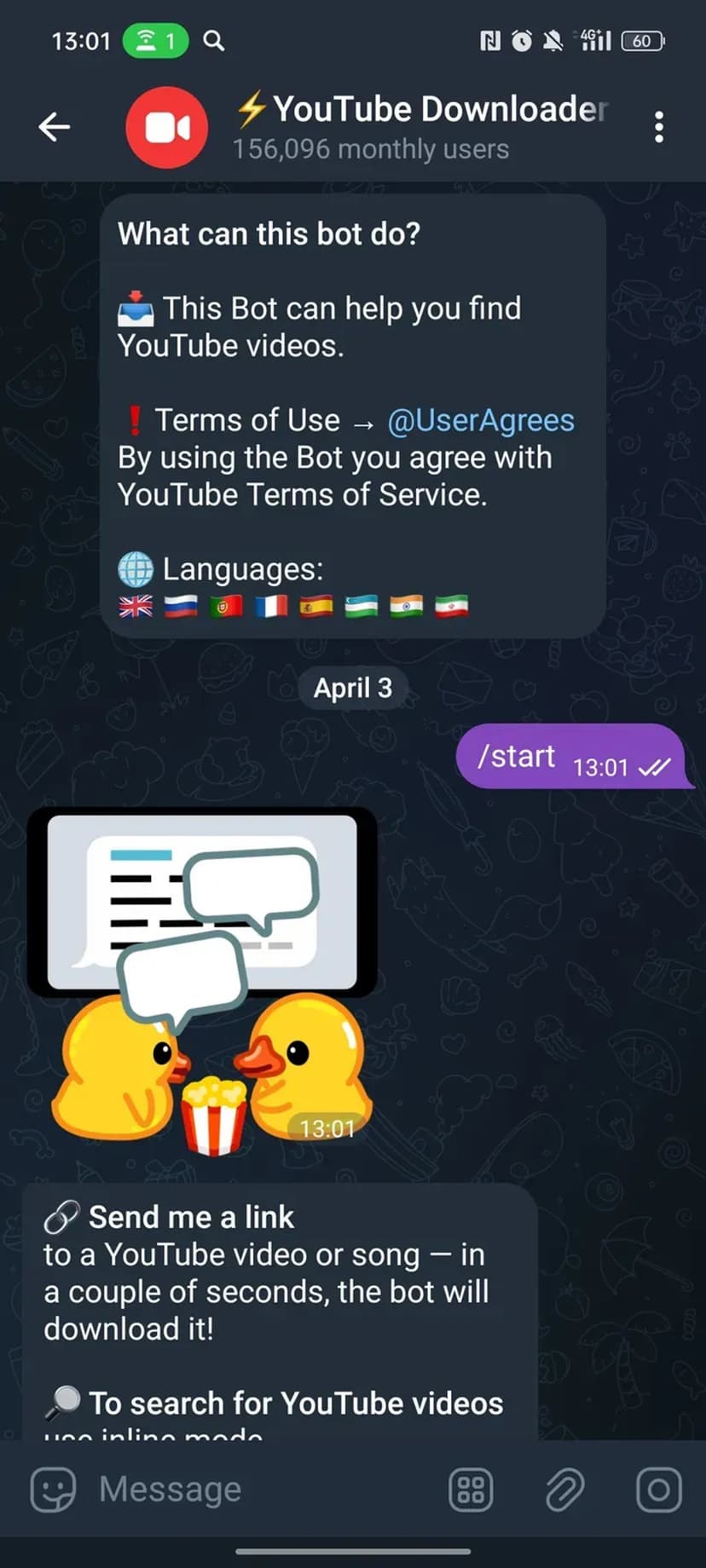Работает через чат-бот: пользователь отправляет ссылку на ролик, выбирает нужный формат и получает готовый файл во вложении, не покидая интерфейс мессенджера и без установки дополнительных приложений.