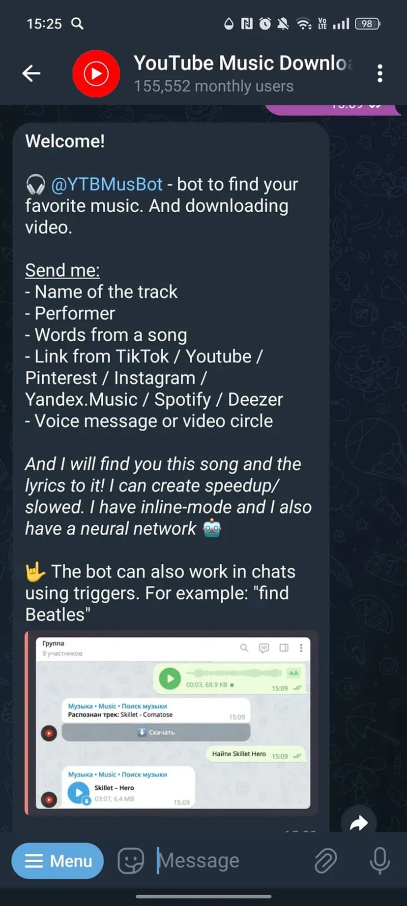 YouTube Music Downloader позволяет быстро находить и скачивать музыкальные треки и тексты по разным входным данным: названию композиции, имени исполнителя, фрагменту текста, ссылке на трек или по голосовому сообщению и видео-кружку. Сервис анализирует полученную информацию и возвращает ссылку для загрузки музыки, а при наличии — лирику песни.