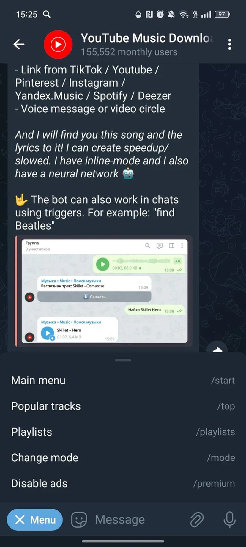 *Нажимая "Открыть в Telegram", вы перейдете к приложению YouTube Music Downloader в мессенджере Telegram