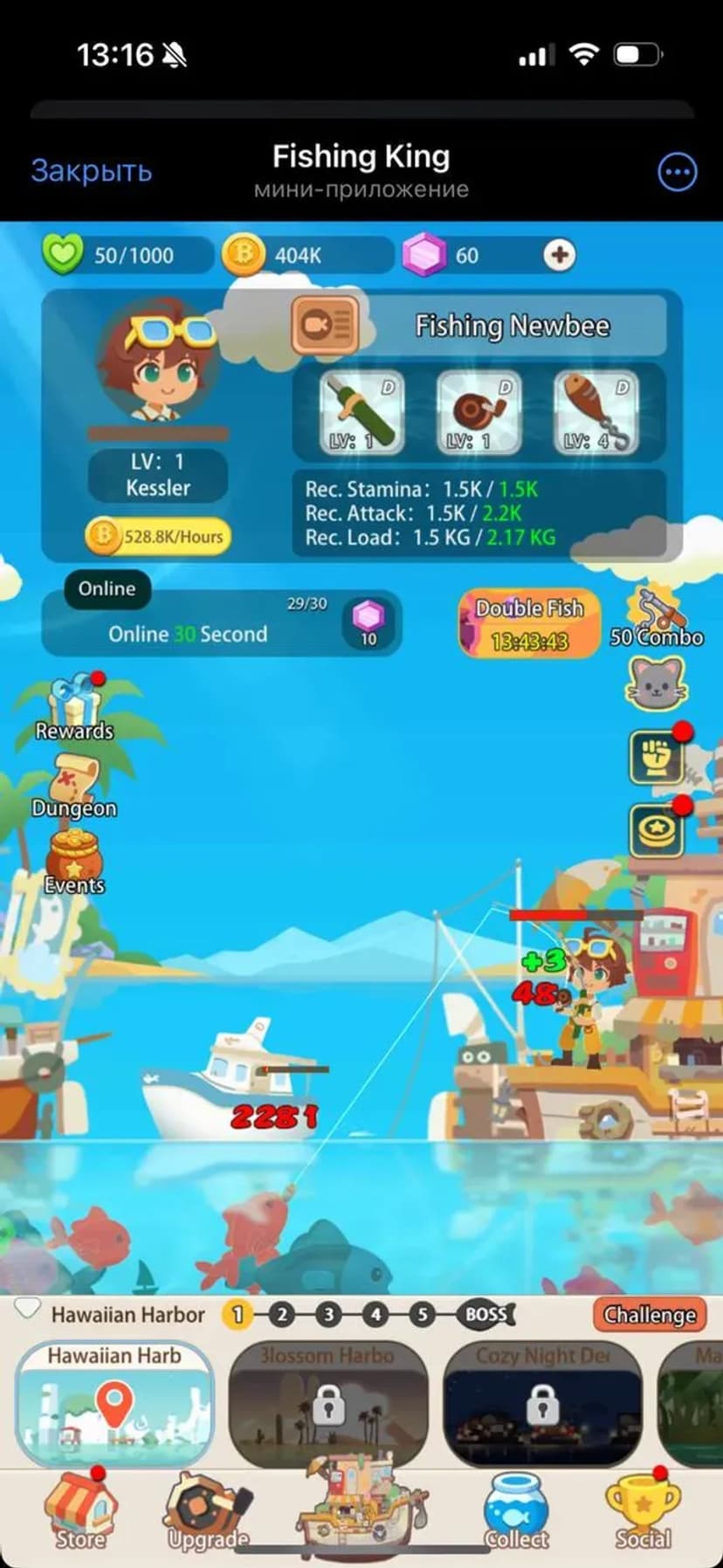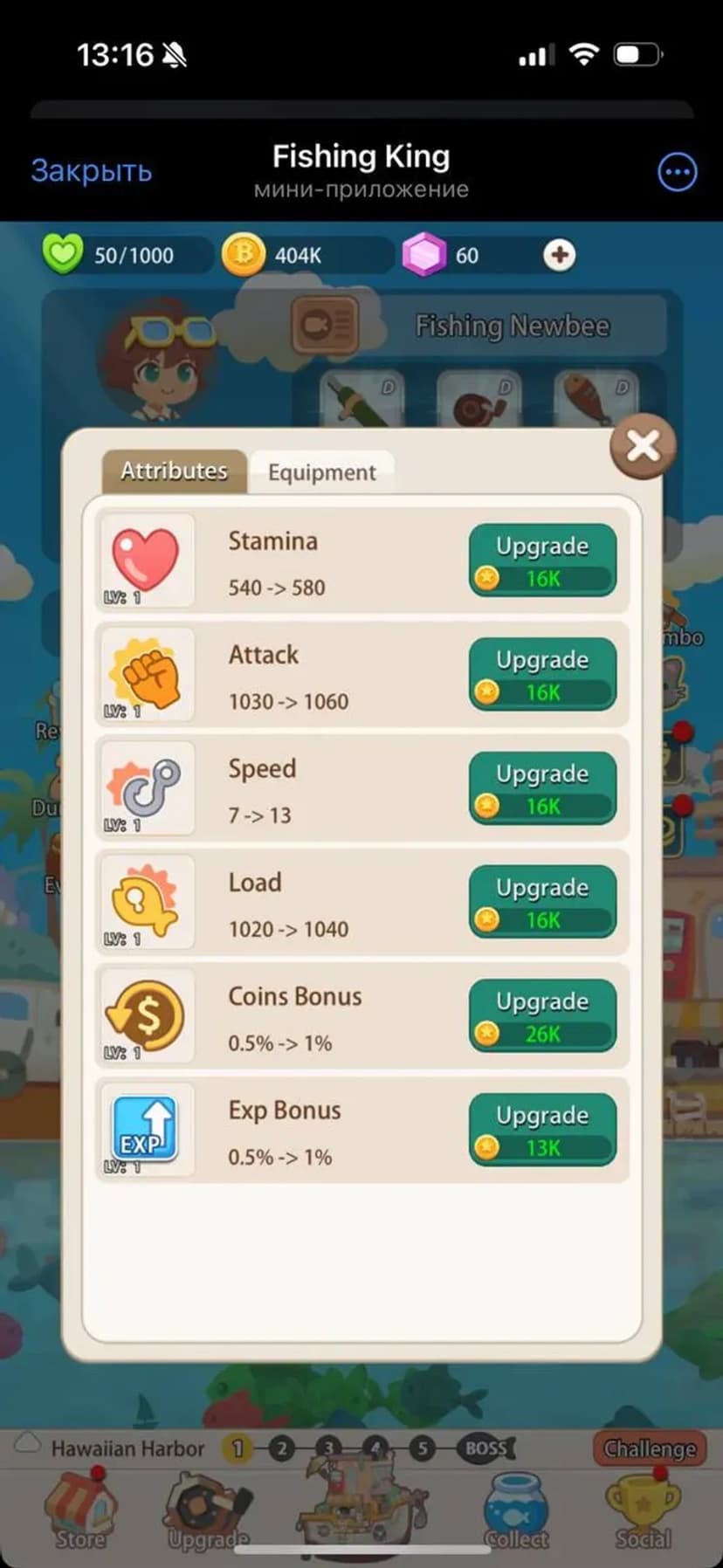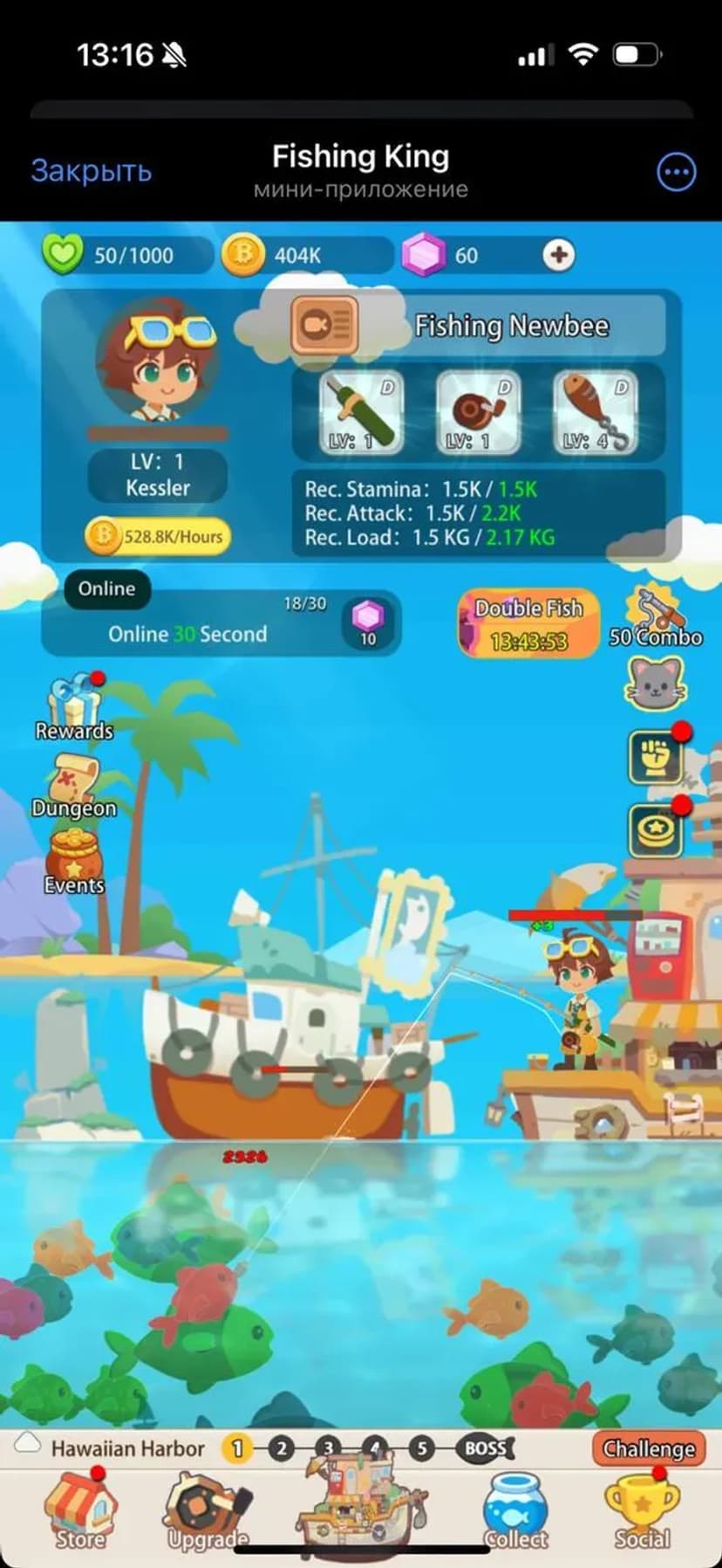 - Прокачка инвентаря: улучшение удочек, лодок и других инструментов;
