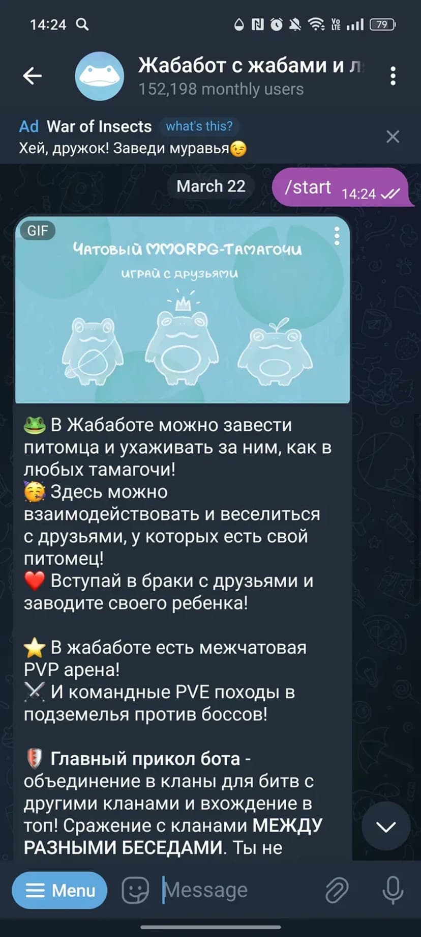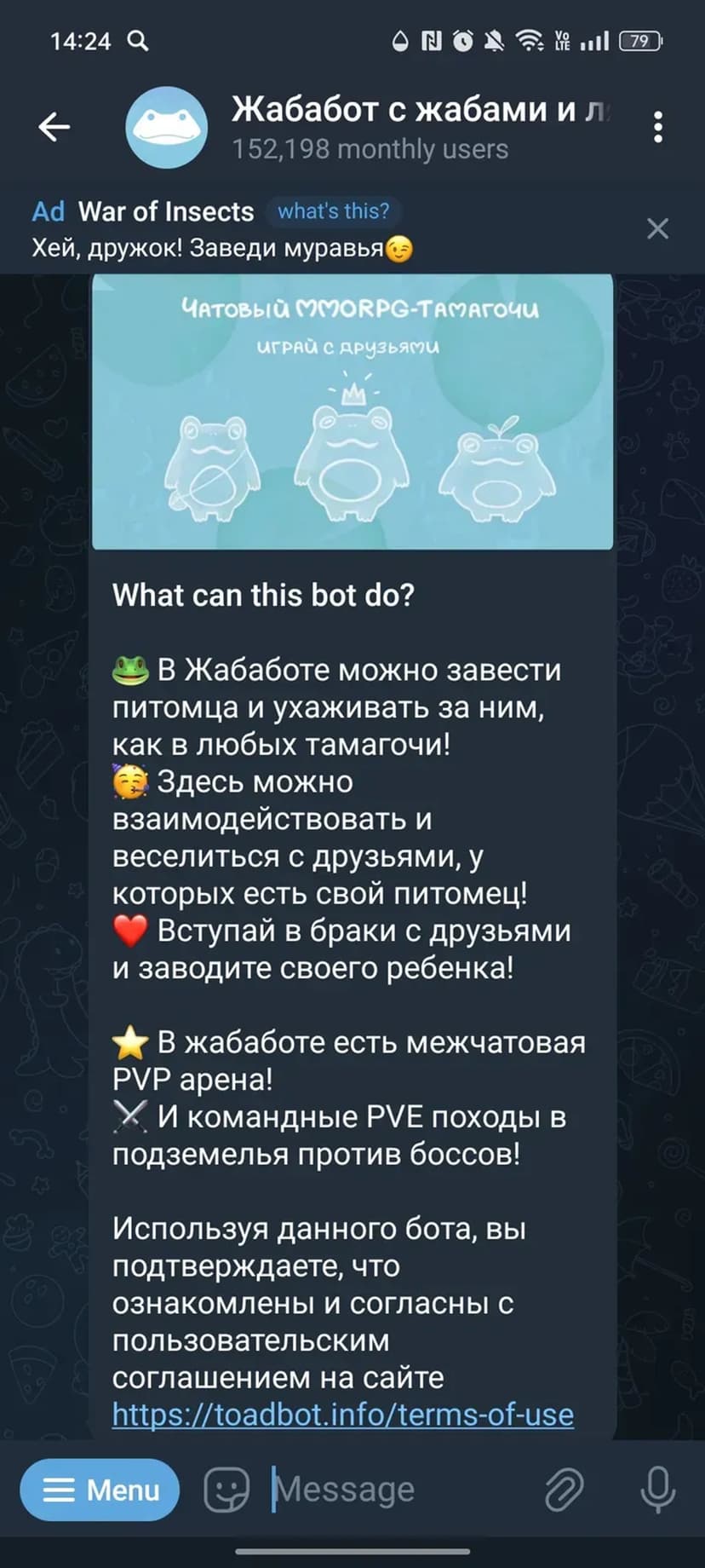*Нажимая "Открыть в Telegram", вы перейдете к приложению Жабабот с жабами и лягушками в мессенджере Telegram