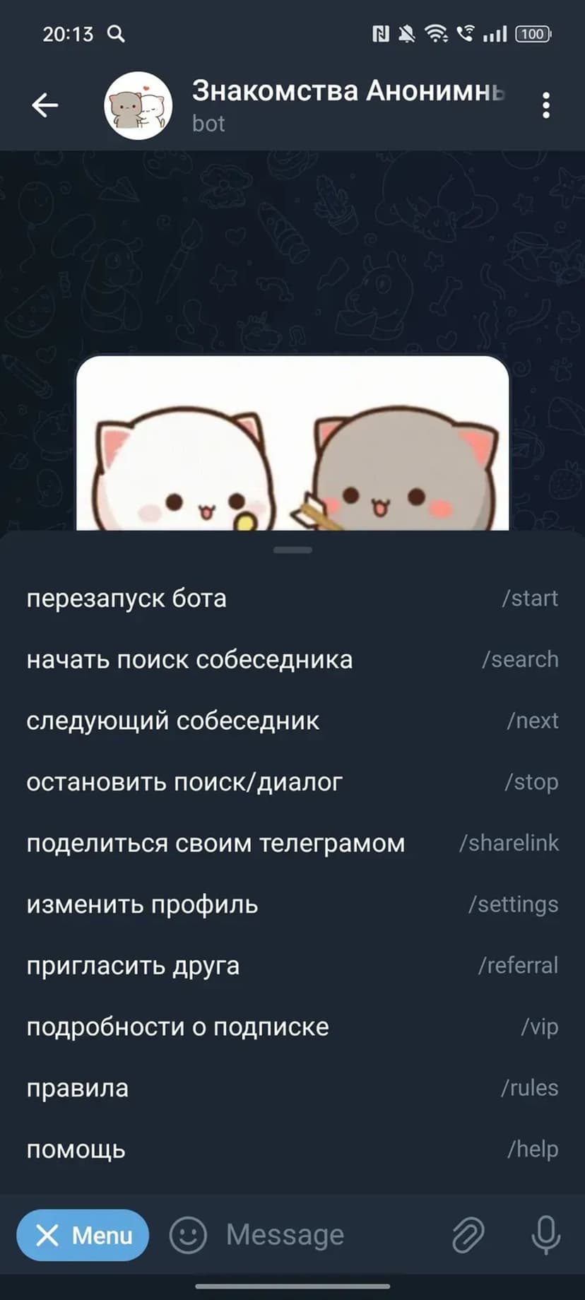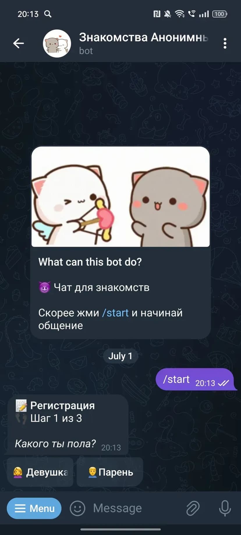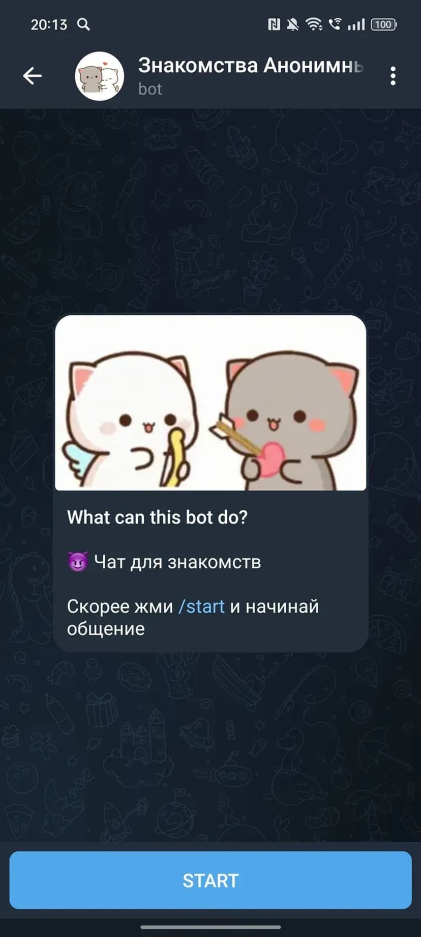 Анонимный чат для знакомств через Telegram-бота: быстрый старт без регистрации и без запроса персональных данных — просто откройте чат и начните общение.