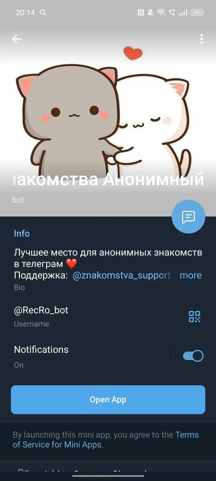 *Нажимая "Открыть в Telegram", вы перейдете к приложению Знакомства Анонимный чат Общение в мессенджере Telegram