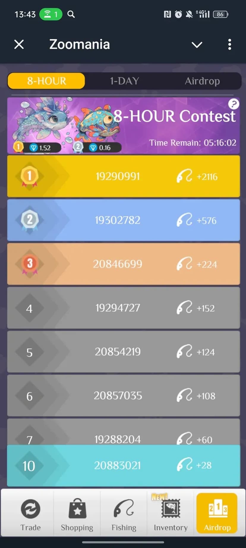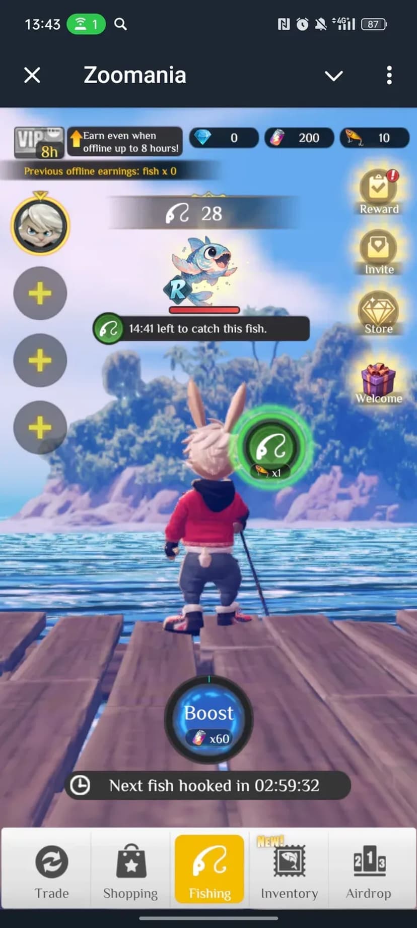 Zoomania переносит в яркий мир с мультяшными животными: в центре экрана — основная зона для рыбалки, навигация осуществляется через понятные кнопки и вкладки для инвентаря, торговли, приглашений и лидерборда.