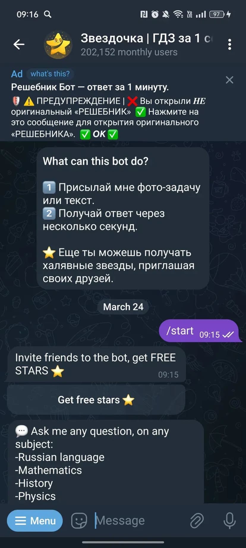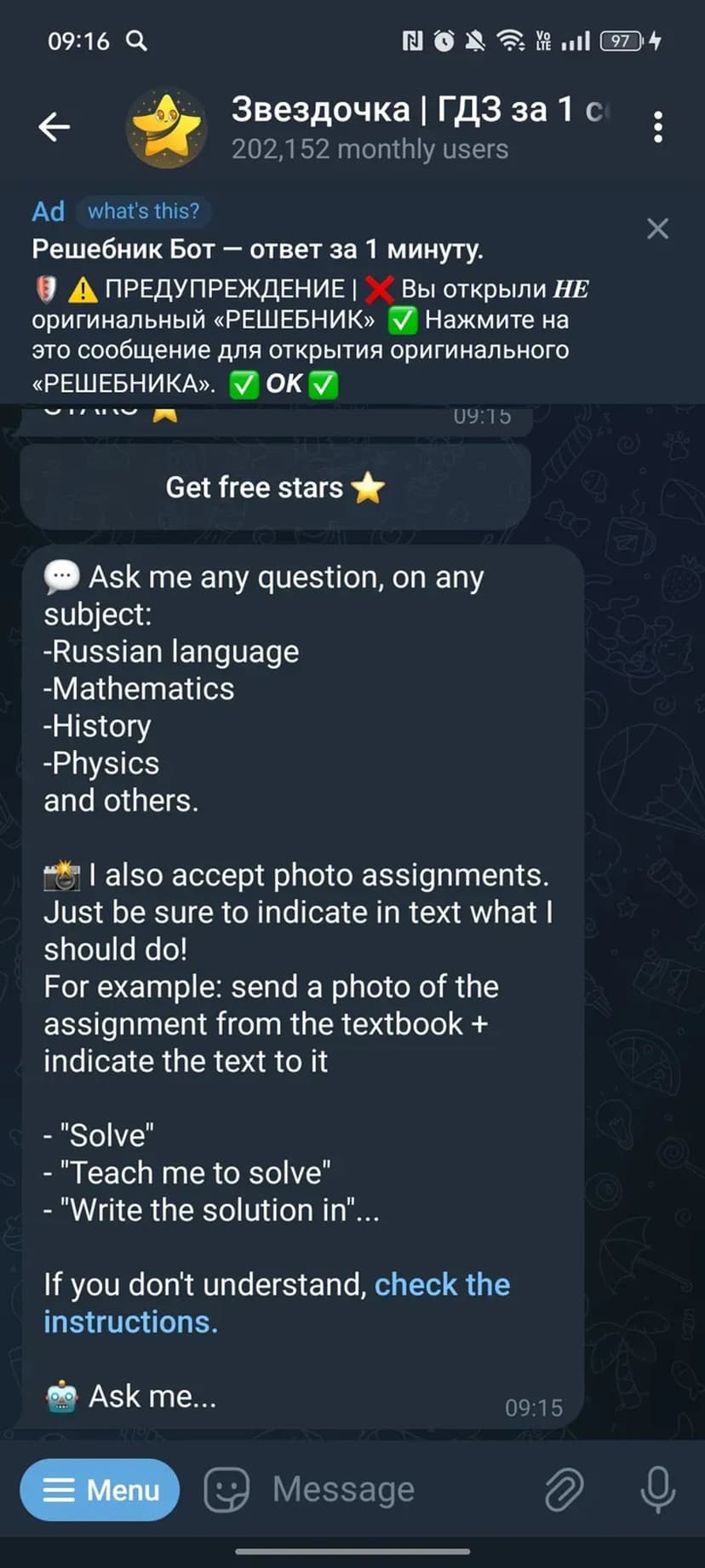 Звездочка — ГДЗ за 1 секунду обеспечивает быстрый поиск готовых решений школьных домашних заданий по фотографии задания или текстовому описанию. После отправки запроса система распознаёт текст и находит наиболее подходящие ответы прямо в Telegram без необходимости регистрации.