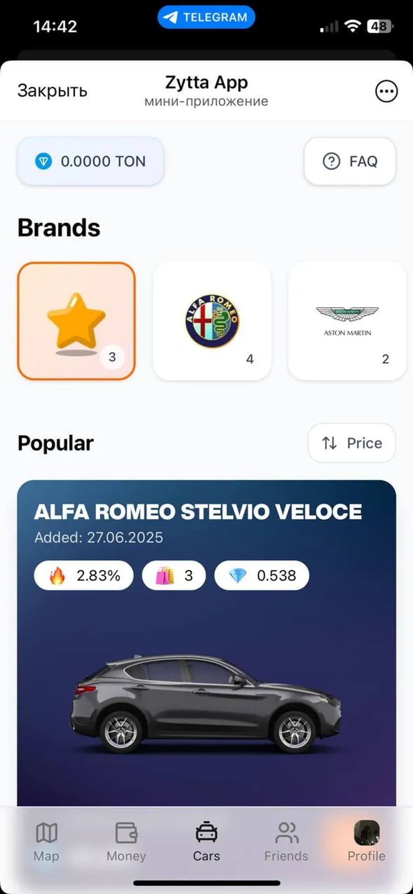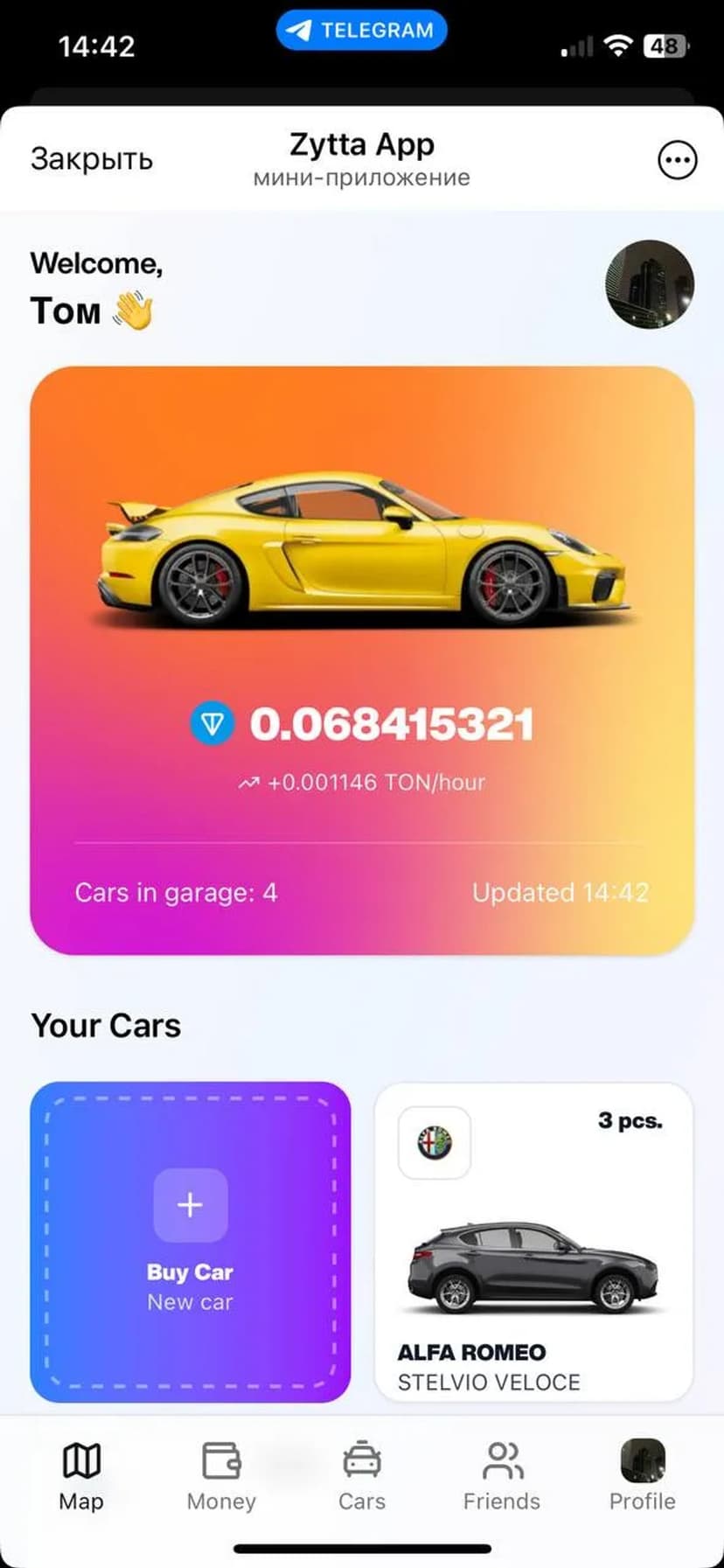 ZYTTA App — симулятор автопарка в экосистеме TON. Пользователи покупают виртуальные автомобили, представленные как NFT, и получают пассивный доход в Toncoin за счёт автоматической сдачи машин в аренду.
